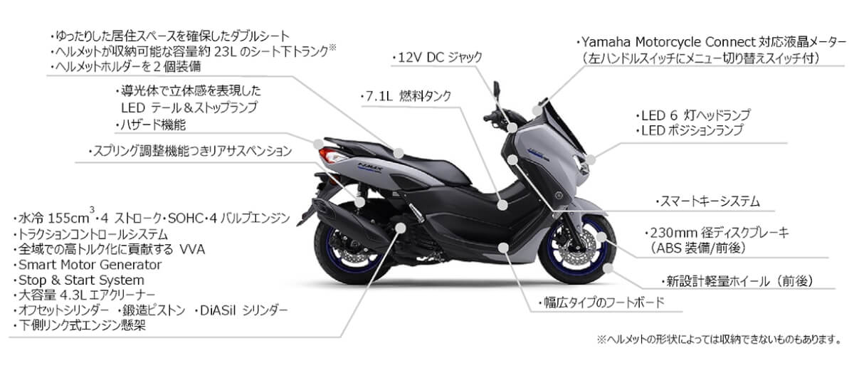 新設計フレームと軽量化された前後ホイールで軽快に走るNMAX155を是非!