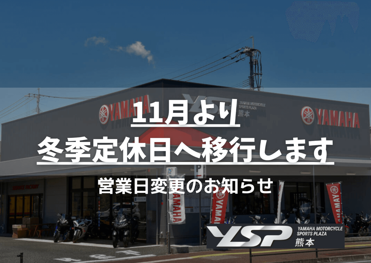 冬季定休日への移行のお知らせ 日頃よりYSP熊本をご愛顧いただきまして、誠にありがとうございます。 11月より冬季定休日へ移行し、 毎週水曜日および木曜日が定休日 となります。 何卒、ご理解頂けますようお願い申し上げます。 引き続き、YSP熊本をご愛顧頂けますようお願い申し上げます。